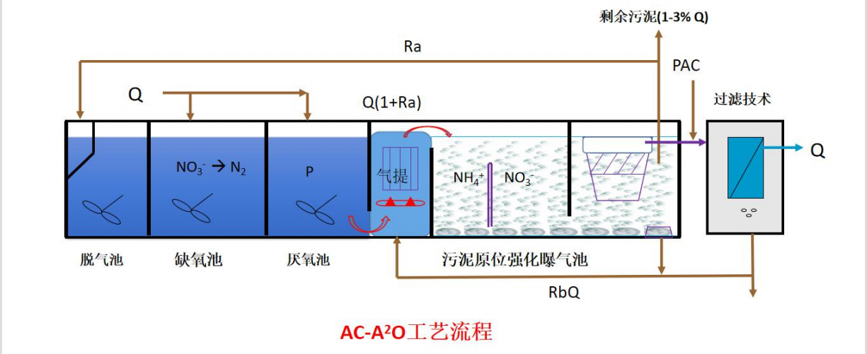 AC-A2O技術(shù)AC-A2O(Advance Anoxic-Anaerobic-Oxic)工藝,采用多點(diǎn)進(jìn)水、倒置A2O的反應(yīng)器,并且把曝氣池與二沉池組合在單池內(nèi),污水完成有機(jī)物的降解及硝化與反硝化生物脫氮后進(jìn)入斜管沉淀池,泥水進(jìn)行快速澄清分離,上清液經(jīng)過過濾和消毒后排放,指標(biāo)優(yōu)于一級(jí)A。沉淀污泥和混合液一起氣提至前端缺氧和厭氧段。為了達(dá)到更嚴(yán)